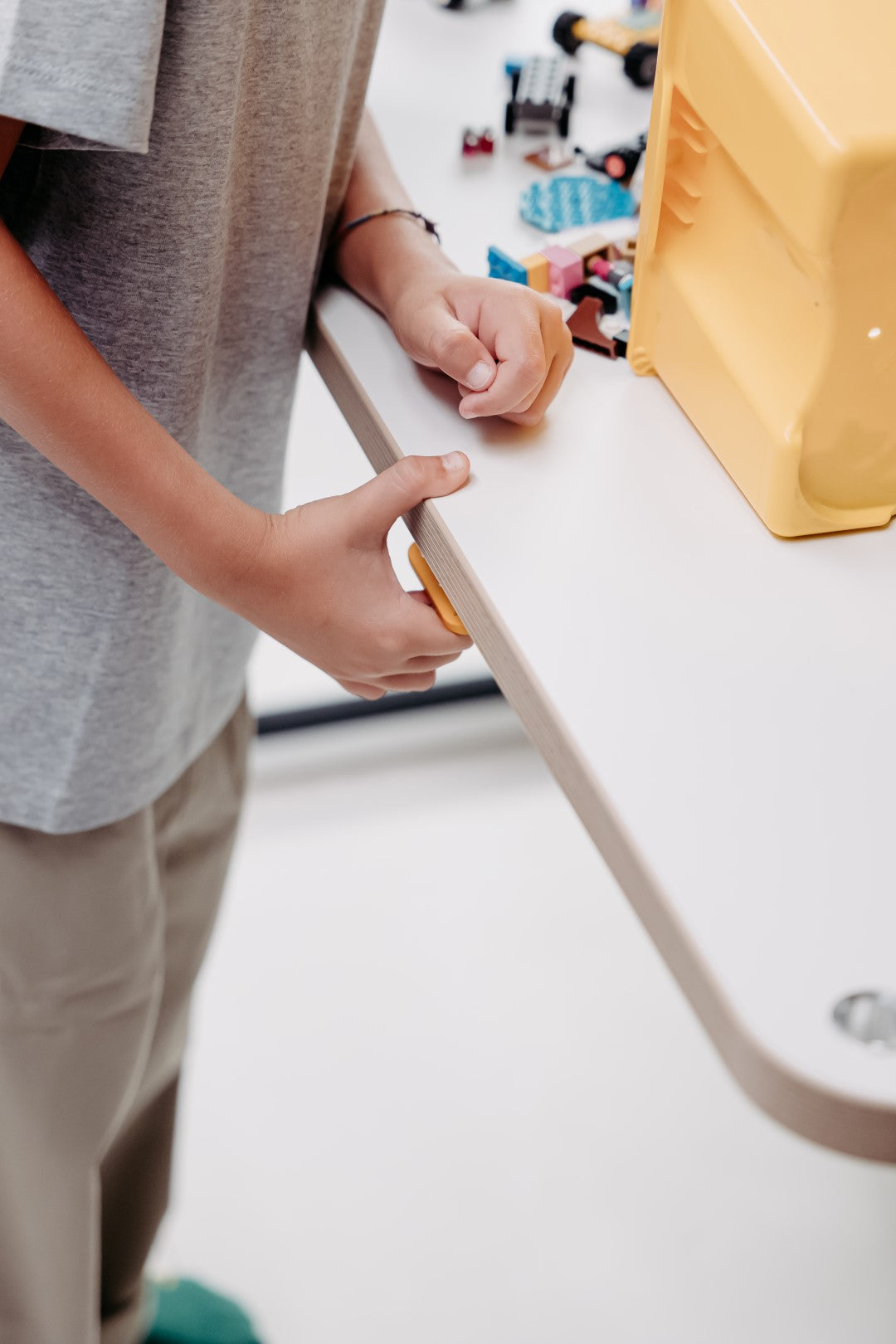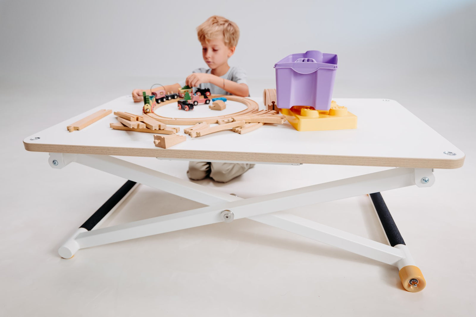 Der höhenverstellbare Tisch in schönem hellem grau, etwas dunkler als der weisse Tisch.