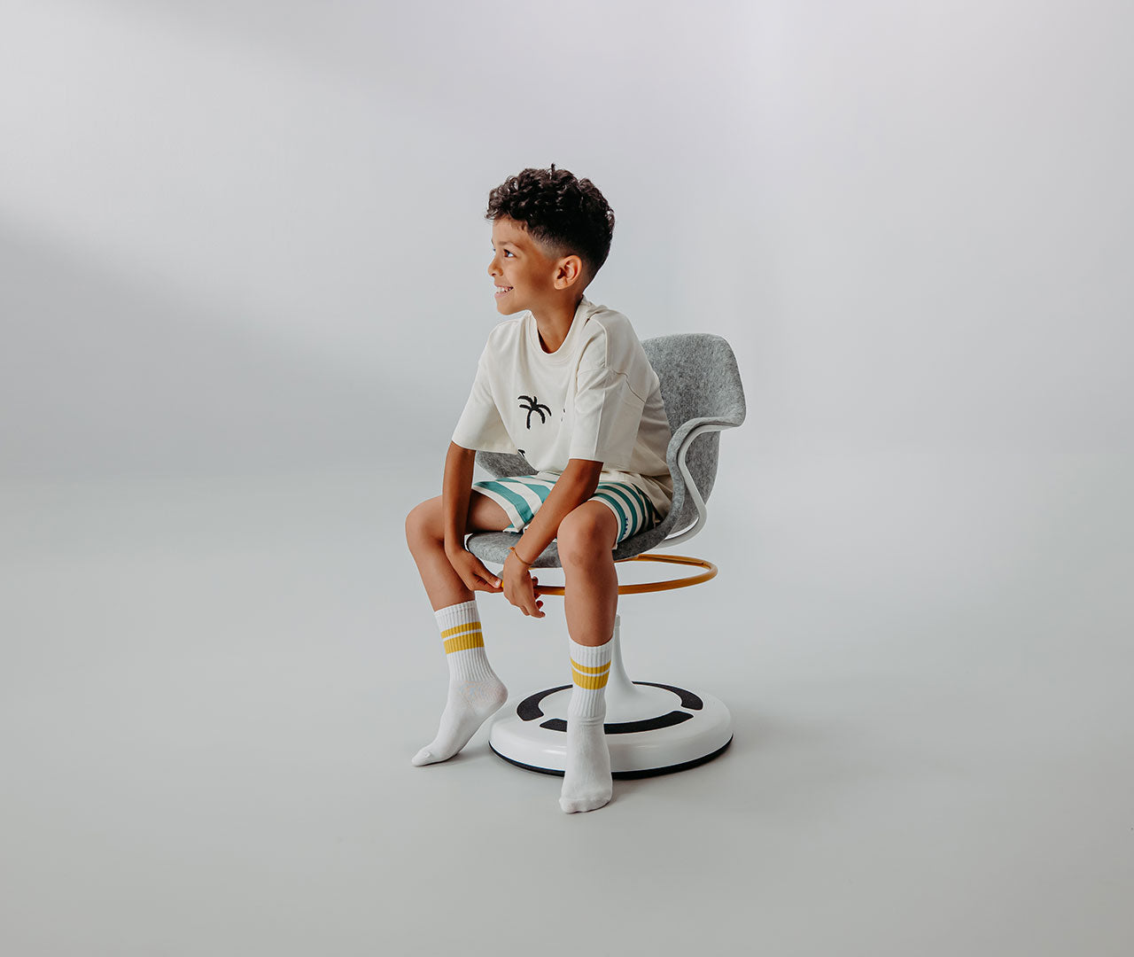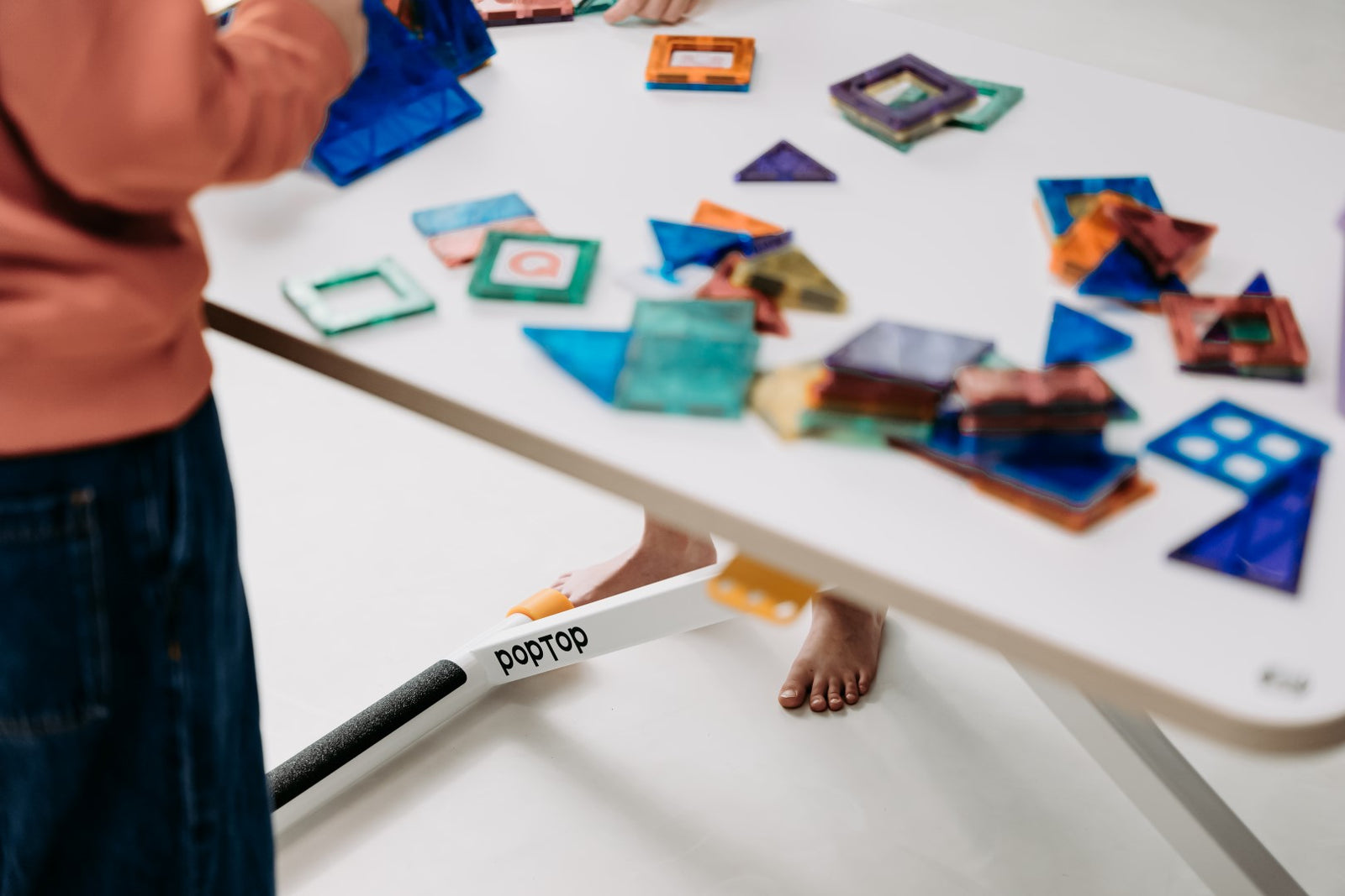 Der Stuhl von Poptop passt natürlich perfekt zum Tisch. Kinder können die Höhe ganz einfach einstellen, und er bietet maximale Bewegungsfreiheit. Das nachhaltige Design verwendet u.a. rezykliertes Pet in der Sitzschale, das Gestell ist aus pulverbeschichtetem Stahl und passt auch farblich zum Tisch.